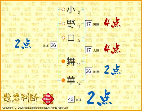 小(3画)野(11画)口(3画) 舞(14画)華(12画)