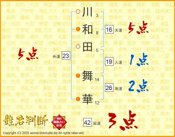 川(3画)和(8画)田(5画) 舞(14画)華(12画)