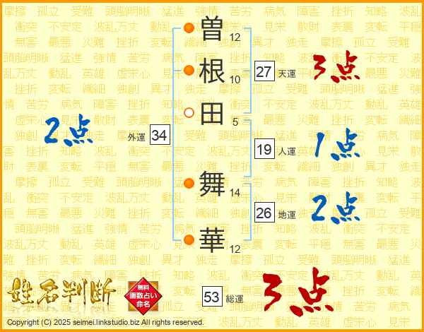 曽(12画)根(10画)田(5画) 舞(14画)華(12画)