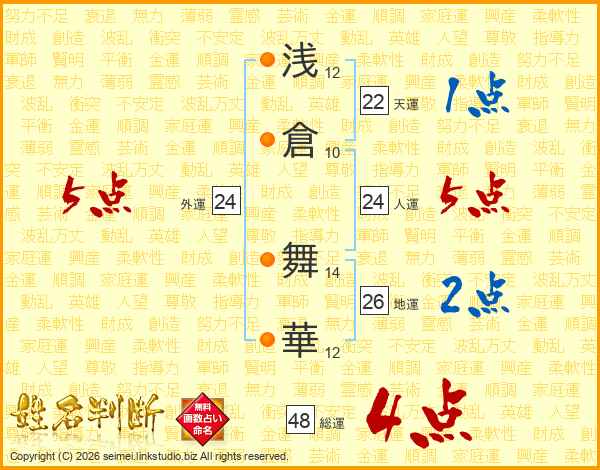 浅(12画)倉(10画) 舞(14画)華(12画)