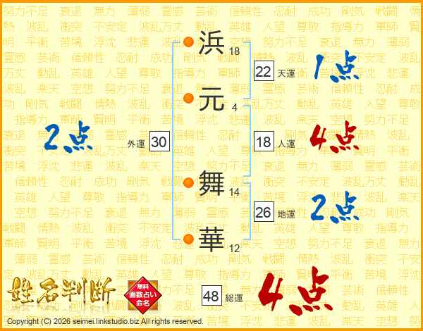 あなたの人生を表す1番重要な運勢です。生涯を通じて影響する総合運となり、主に50歳以降の晩年期に影響を及ぼします。苗字と名前の合計画数。