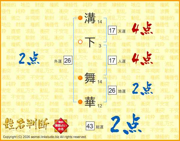 生活面を象徴する運勢です。外部から受ける影響力を表し、結婚運、家庭運や職場、環境への順応性を表します。総運から人運を引いた画数。姓や名が1文字の場合を除く。