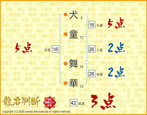 あなたの人生を表す1番重要な運勢です。生涯を通じて影響する総合運となり、主に50歳以降の晩年期に影響を及ぼします。苗字と名前の合計画数。