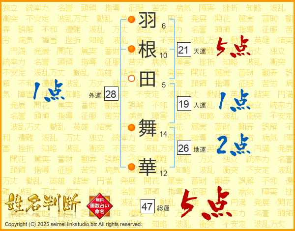 羽(6画)根(10画)田(5画) 舞(14画)華(12画)