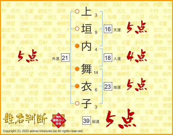 上(3画)垣(9画)内(4画) 舞(14画)衣(6画)子(3画)