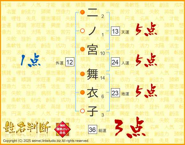 二(2画)ノ(1画)宮(10画) 舞(14画)衣(6画)子(3画)