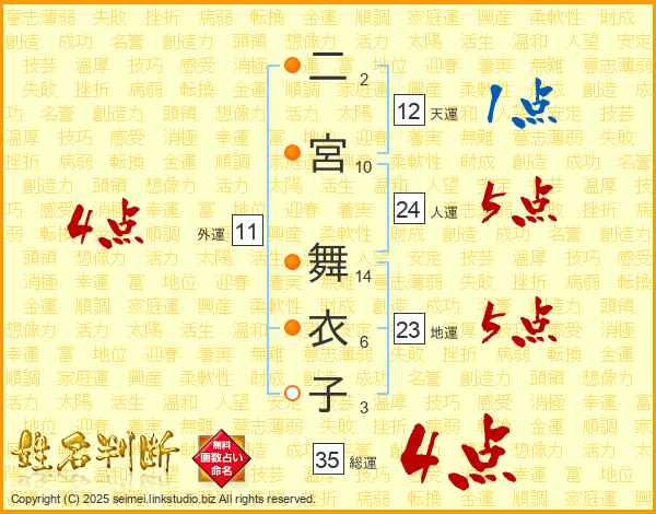 二(2画)宮(10画) 舞(14画)衣(6画)子(3画)