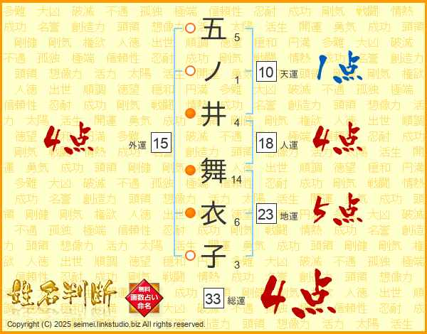 五(5画)ノ(1画)井(4画) 舞(14画)衣(6画)子(3画)
