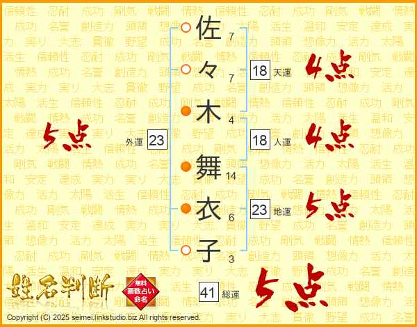 佐(7画)々(7画)木(4画) 舞(14画)衣(6画)子(3画)