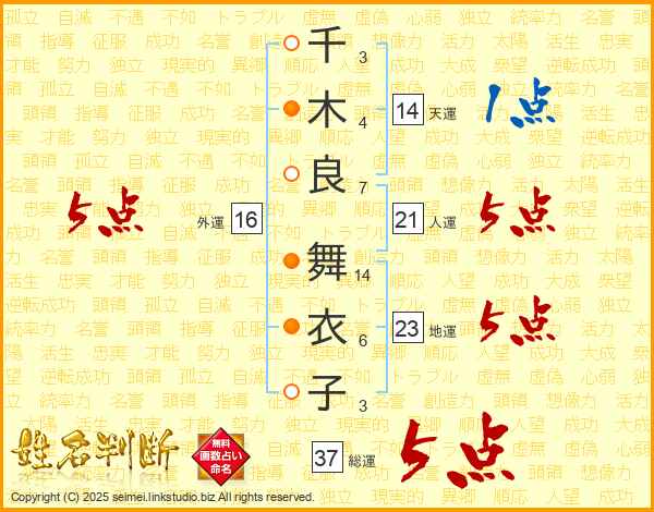 千(3画)木(4画)良(7画) 舞(14画)衣(6画)子(3画)