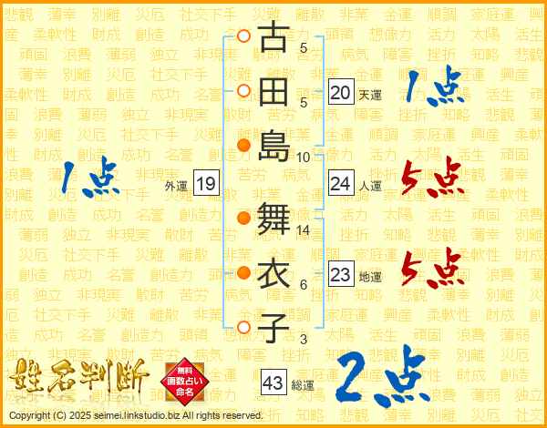 古(5画)田(5画)島(10画) 舞(14画)衣(6画)子(3画)