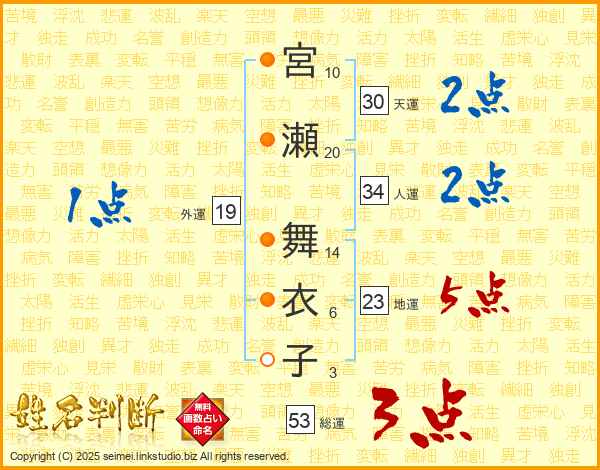 宮(10画)瀬(20画) 舞(14画)衣(6画)子(3画)