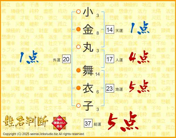 小(3画)金(8画)丸(3画) 舞(14画)衣(6画)子(3画)