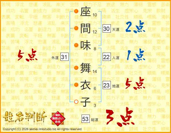 座(10画)間(12画)味(8画) 舞(14画)衣(6画)子(3画)