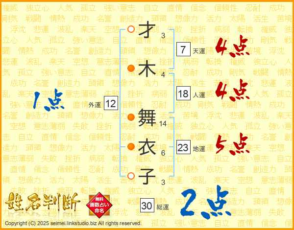 才(3画)木(4画) 舞(14画)衣(6画)子(3画)