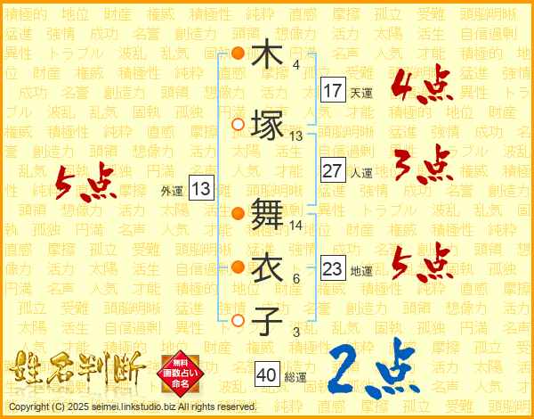 木(4画)塚(13画) 舞(14画)衣(6画)子(3画)