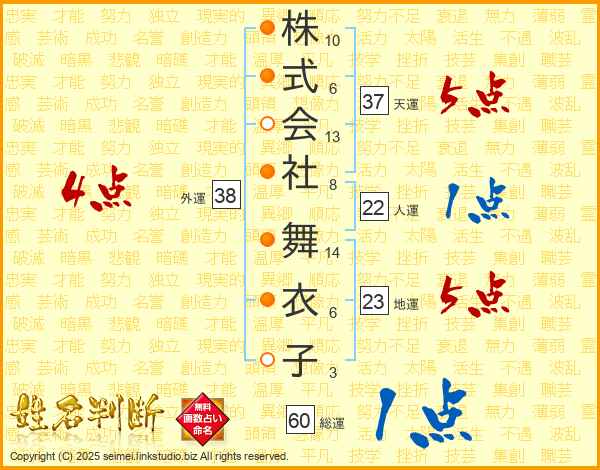 株式会社舞衣子さんの総運は60画の1点!