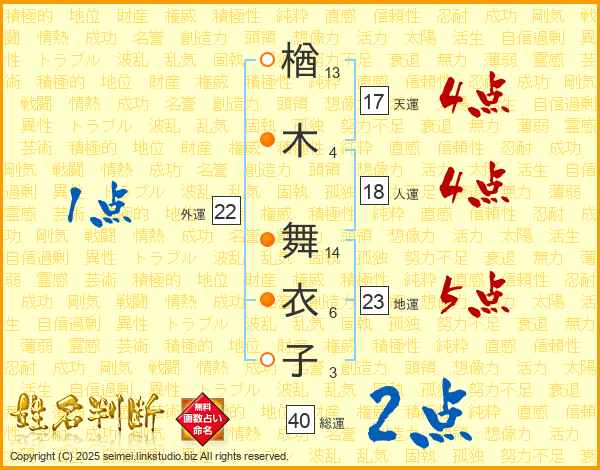 楢(13画)木(4画) 舞(14画)衣(6画)子(3画)