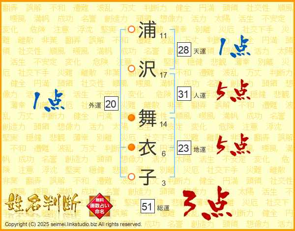浦(11画)沢(17画) 舞(14画)衣(6画)子(3画)