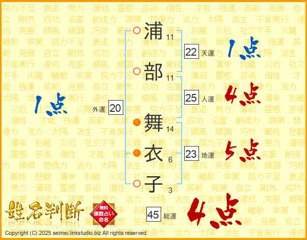 浦(11画)部(11画) 舞(14画)衣(6画)子(3画)