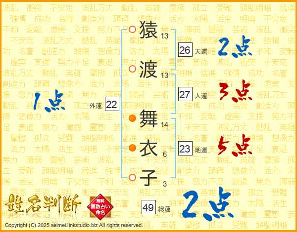 猿渡舞衣子さんの総運は49画の2点!