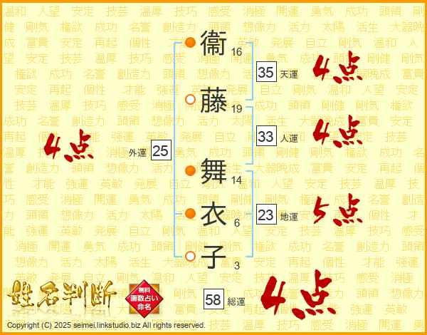 衞(16画)藤(19画) 舞(14画)衣(6画)子(3画)