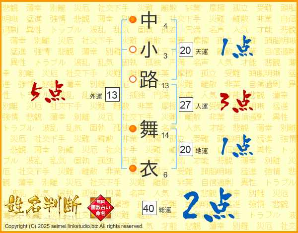 生活面を象徴する運勢です。外部から受ける影響力を表し、結婚運、家庭運や職場、環境への順応性を表します。総運から人運を引いた画数。姓や名が1文字の場合を除く。