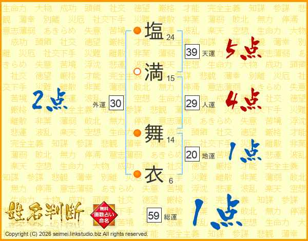塩(24画)満(15画) 舞(14画)衣(6画)