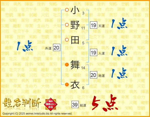 小(3画)野(11画)田(5画) 舞(14画)衣(6画)