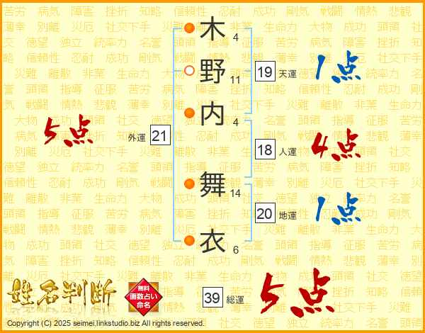 木(4画)野(11画)内(4画) 舞(14画)衣(6画)