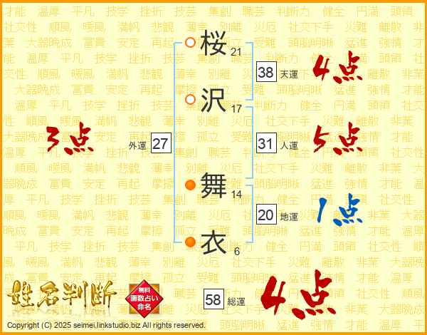 桜(21画)沢(17画) 舞(14画)衣(6画)
