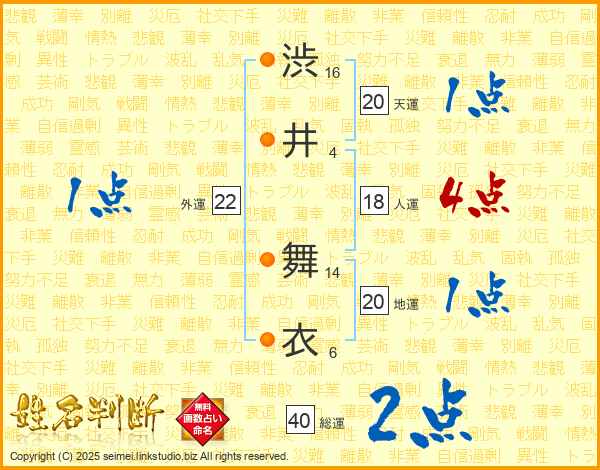 渋(16画)井(4画) 舞(14画)衣(6画)