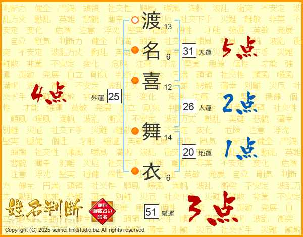 渡(13画)名(6画)喜(12画) 舞(14画)衣(6画)