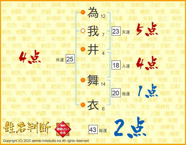為我井舞衣さんの総運は43画の2点!