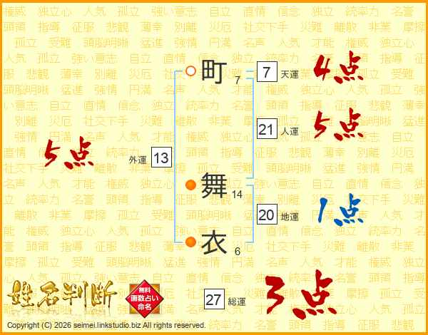 生活面を象徴する運勢です。外部から受ける影響力を表し、結婚運、家庭運や職場、環境への順応性を表します。総運から人運を引いた画数。姓や名が1文字の場合を除く。