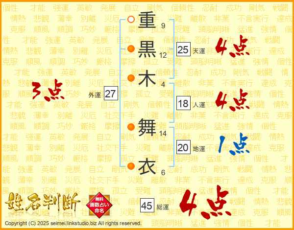 重(9画)黒(12画)木(4画) 舞(14画)衣(6画)