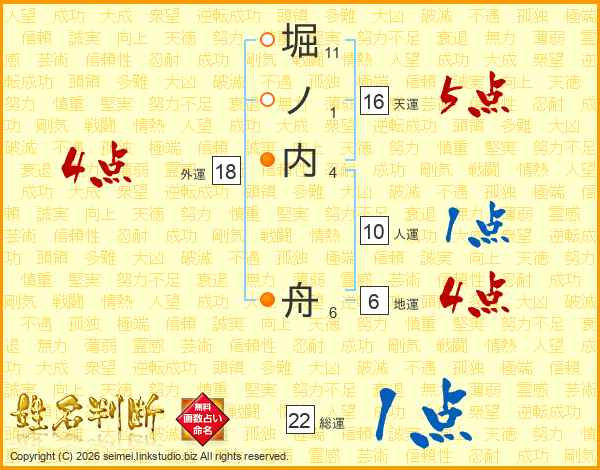 生活面を象徴する運勢です。外部から受ける影響力を表し、結婚運、家庭運や職場、環境への順応性を表します。総運から人運を引いた画数。姓や名が1文字の場合を除く。