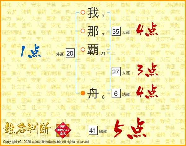 生活面を象徴する運勢です。外部から受ける影響力を表し、結婚運、家庭運や職場、環境への順応性を表します。総運から人運を引いた画数。姓や名が1文字の場合を除く。