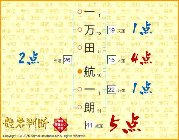 一(1画)万(13画)田(5画) 航(10画)一(1画)朗(11画)