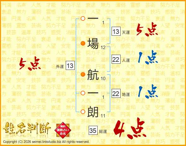 一(1画)場(12画) 航(10画)一(1画)朗(11画)