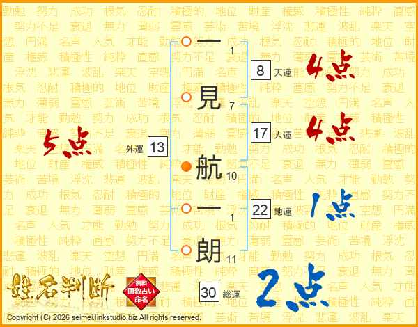 一(1画)見(7画) 航(10画)一(1画)朗(11画)