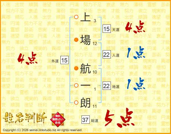 上(3画)場(12画) 航(10画)一(1画)朗(11画)