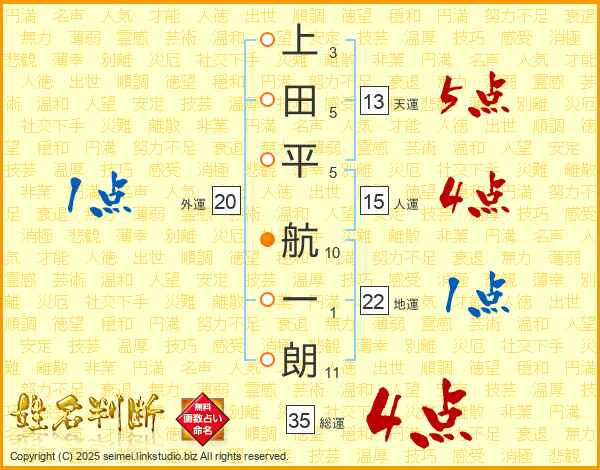 上(3画)田(5画)平(5画) 航(10画)一(1画)朗(11画)
