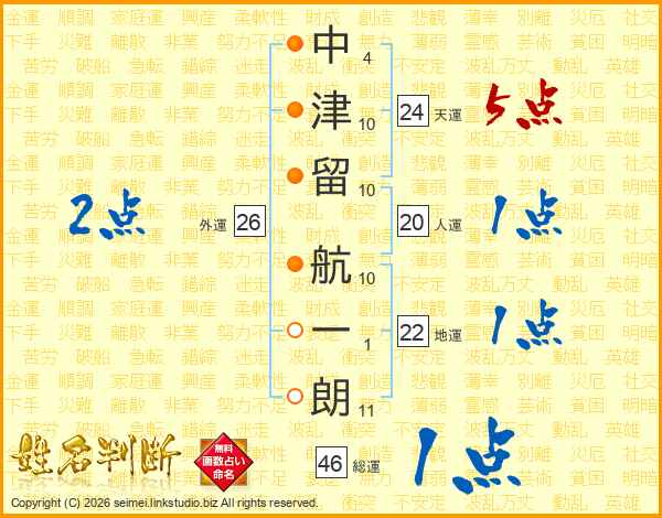 中(4画)津(10画)留(10画) 航(10画)一(1画)朗(11画)