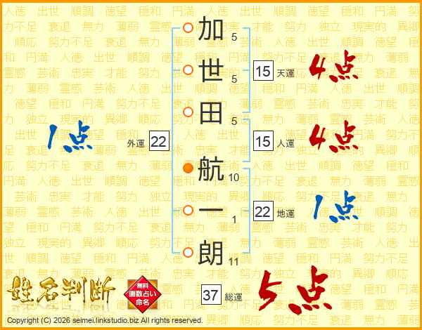 加(5画)世(5画)田(5画) 航(10画)一(1画)朗(11画)