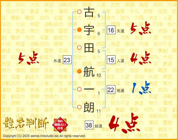 古(5画)宇(6画)田(5画) 航(10画)一(1画)朗(11画)