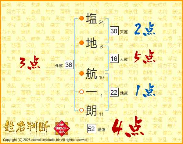 塩(24画)地(6画) 航(10画)一(1画)朗(11画)