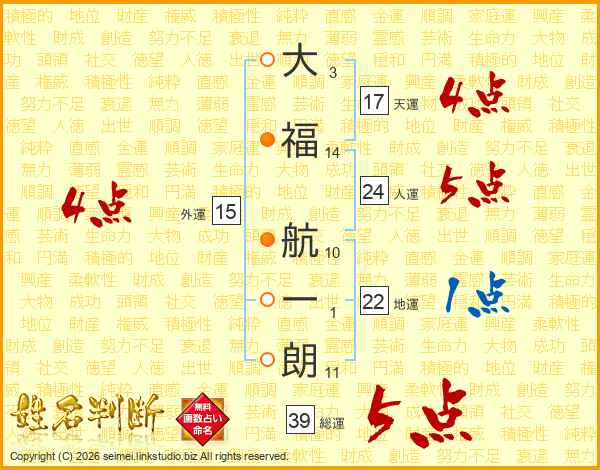 大(3画)福(14画) 航(10画)一(1画)朗(11画)