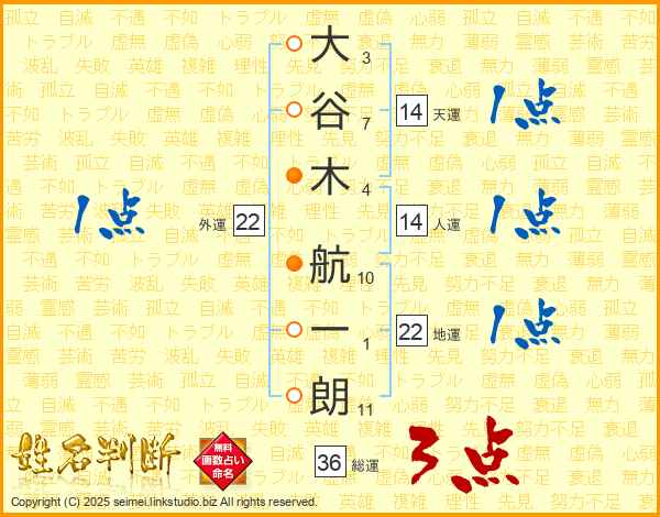 大(3画)谷(7画)木(4画) 航(10画)一(1画)朗(11画)