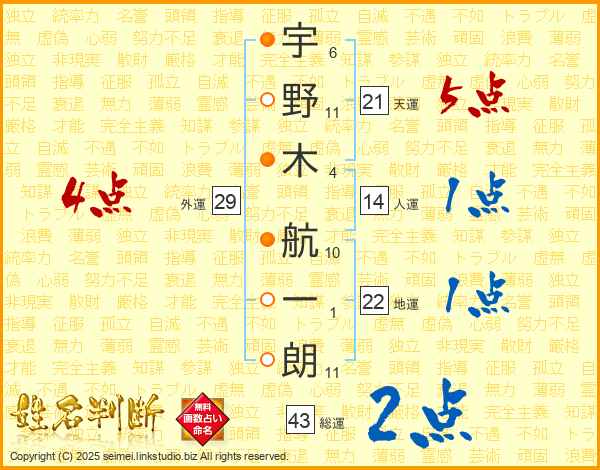 宇野木航一朗さんの天運は21画の5点!